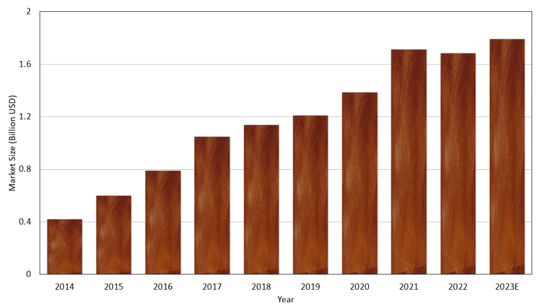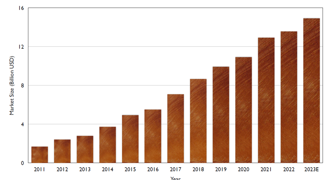 图1:2011年至2023年的中国激光市场。2022年,中国工业激光市场达135亿美元,年增长率为5%。