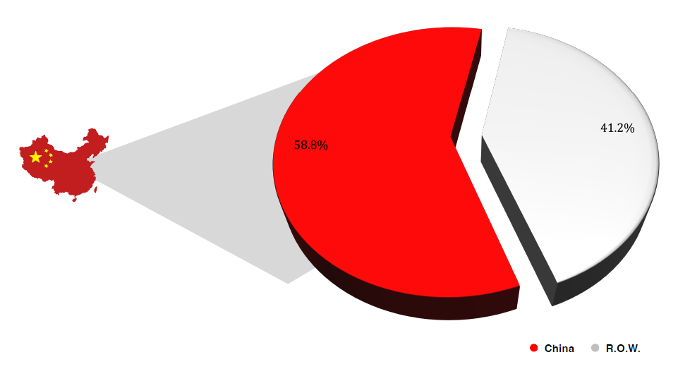 图2:工业激光器的全球市场份额。2022年,中国工业激光市场在全球工业激光市场中所占据的份额,降至58.8%。2021年为60.1%。
