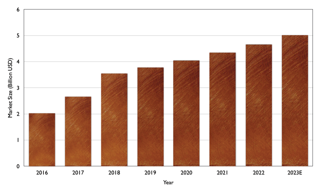 中国激光切割机市场受到了光纤激光器市场的影响。尽管光纤激光切割机的销量增长迅速,但设备的单价却有所下降。随着利润率的下降,许多中国企业将目光转向了海外市场。2022年,中国切割机总体市场达46亿美元,预计2023年有望超过50亿美元,同比增长7.6%(见图5)。