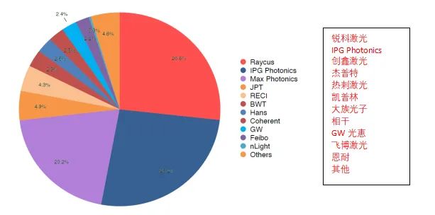 图4:中国市场中各家光纤激光器供应商的市场份额。最近国内和国际供应商之间的份额占比发生了显著变化,锐科激光以26.8%的市场份额,超越IPG Photonics成为新的市场领导者。