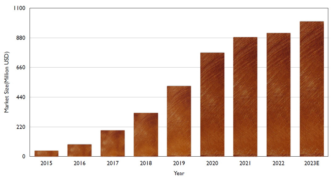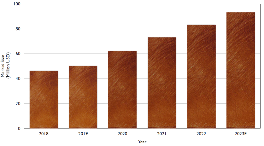 图9:2018年至2023年的中国激光清洗系统市场。由于光纤激光器和直接二极管激光器的低成本,2022年中国激光清洗市场快速增长,市场总额达到8300万美元,预计2023年将达到9300万美元左右。